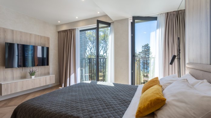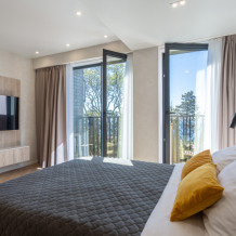 В апартаменте: одна двуспальная кровать Askona, с ортопедическим матрасом Askona, 160 х 200 см, один двуспальный раскладной диван с ортопедическим матрасом, ТВ 60», с подключенным сервисом «Кинопоиск» и «OKKO», кондиционер, микроволновая печь, стиральная машина, фен, холодильник, варочная панель, чайник, кофе машина, комплект посуды, утюг и гладильная доска, хорошее сатиновое белье, полотенца, туалетные принадлежности. На балконе с видом на море, приятно выпить утреннюю чашку кофе, в кресле.