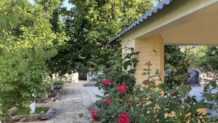 Большой двор который вмешает 5-6 машин, во дворе беседка, слон фонтан для детей, большой каркасный бассейн, санузел, так же имеется большая столовая-зал с мангальной зоной, во дворе есть отдельно мангал, много плодоносящих деревьев, гости могут сколько захотят пробовать со всего, что будет расти по сезону.