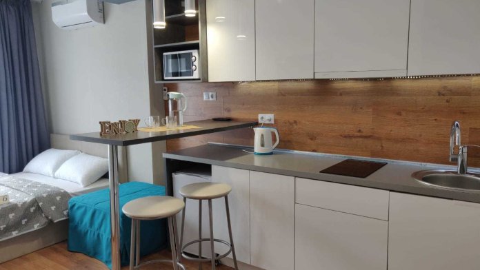 Двухкомнатная квартира, в которой каждая комната может быть отдельной студией. В каждой комнате есть кухня с посудой и приборами, кухонной мебелью: столы и стулья, кухонные гарнитуры.