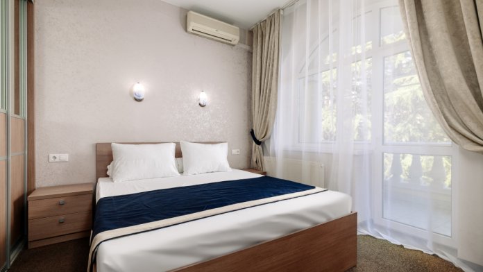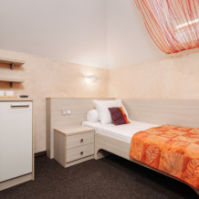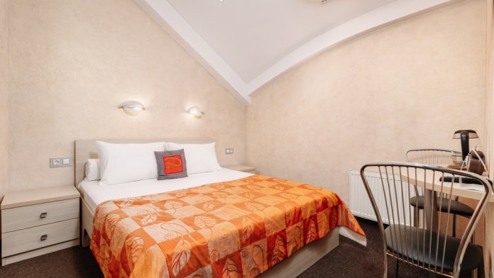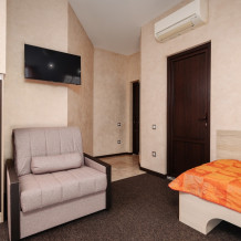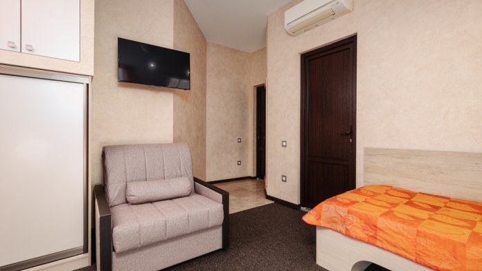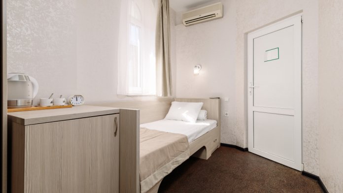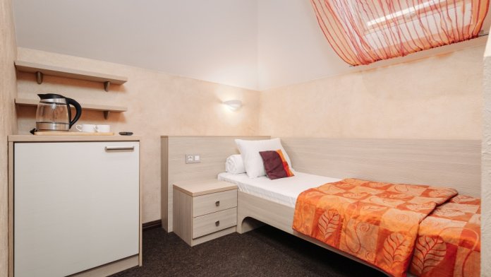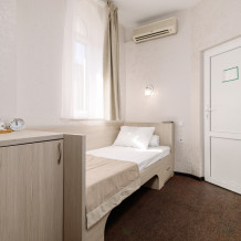 Одноместный номер, площадью 12 кв.м, в котором установлена односпальная кровать, расположен на 3 этаже. Номер оснащен всеми современными удобствами, которые сделают Ваш отдых максимально комфортным: сплит-система, ТВ, Wi-Fi, холодильник, набор посуды, электрический чайник, фен, туалетно-косметические принадлежности (гель для душа, мыло, шампунь), полотенца. Ванная комната с душем и санузлом.