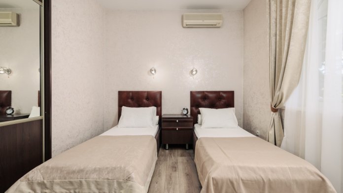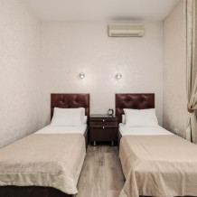 Двухместный номер 15 кв.м. с двумя раздельными кроватями расположенный на 2,3 этаже. Уютный балкончик является отличным дополнением. Номер оснащен всеми современными удобствами, которые сделают Ваш отдых максимально комфортным: сплит-система, ТВ, Wi-Fi, холодильник, набор посуды, сушилка, электрический чайник, фен, туалетно-косметические принадлежности (гель для душа, мыло, шампунь), полотенца. Ванная комната с душем и санузлом. На этаже имеется зона отдыха, утюг, гладильные принадлежности общего пользования.