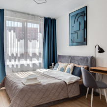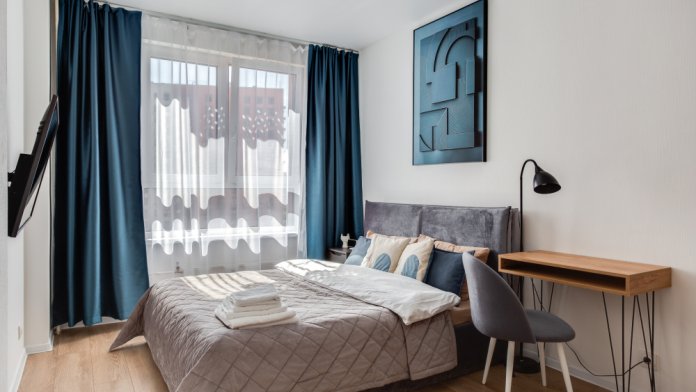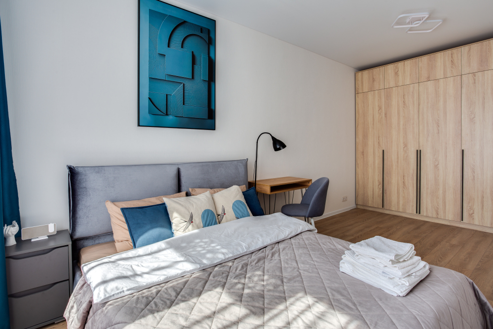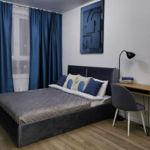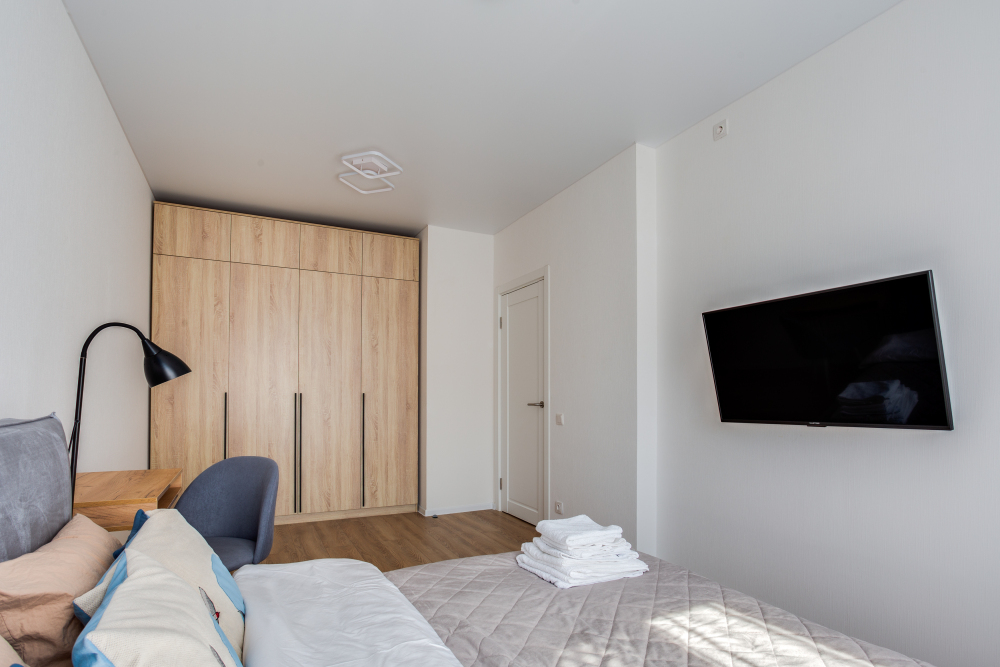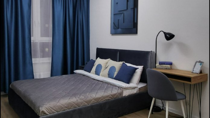 - Всю необходимую мебель (одна двуспальная кровать, 2 тумбочки, рабочий стол со стулом, большие шкафы для одежды).
