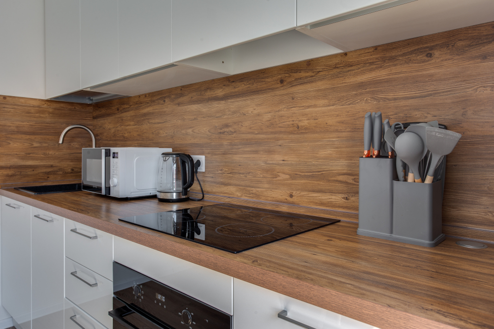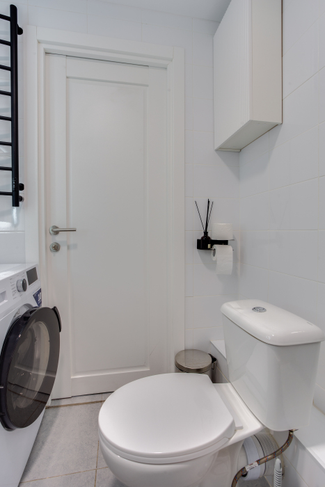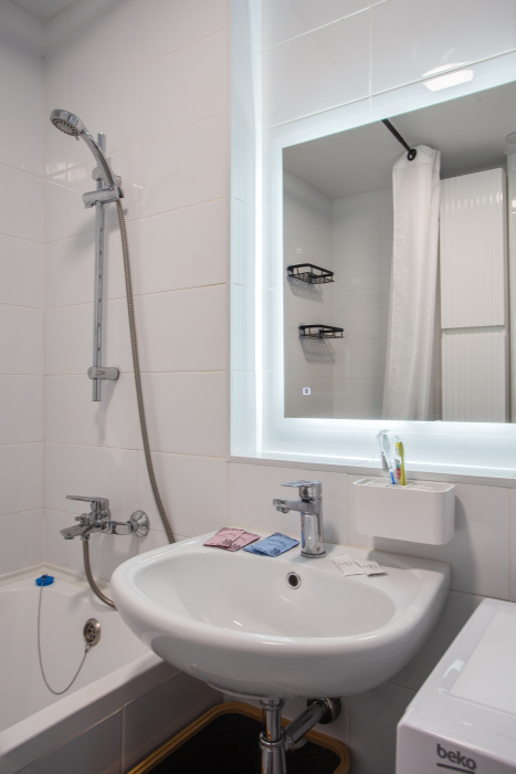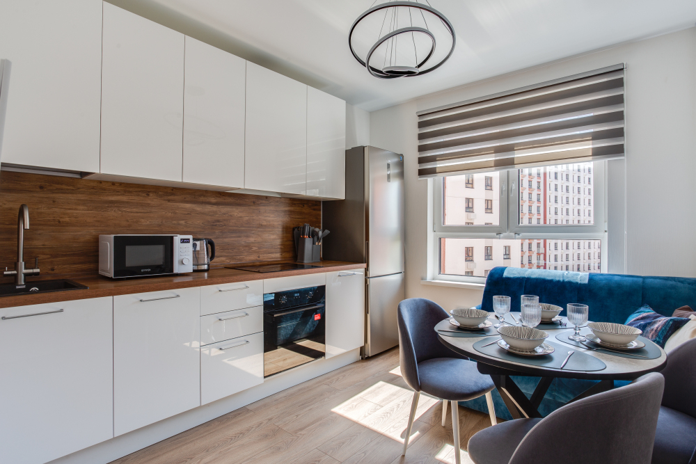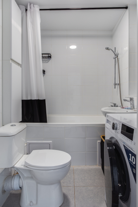 - Бытовую технику (большой холодильник, посудомоечная машина, электрочайник, варочная панель, духовой шкаф, стиральная машина, фен, телевизор, беспроводной доступ к интернету Wi-Fi).