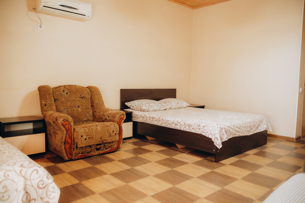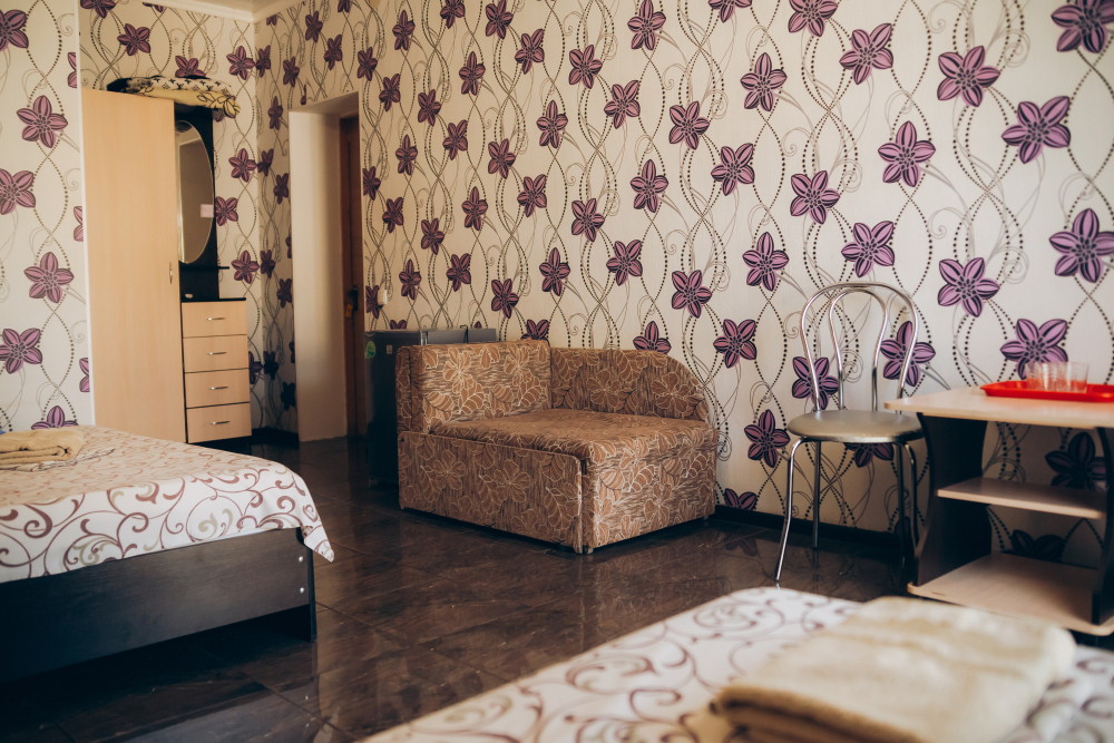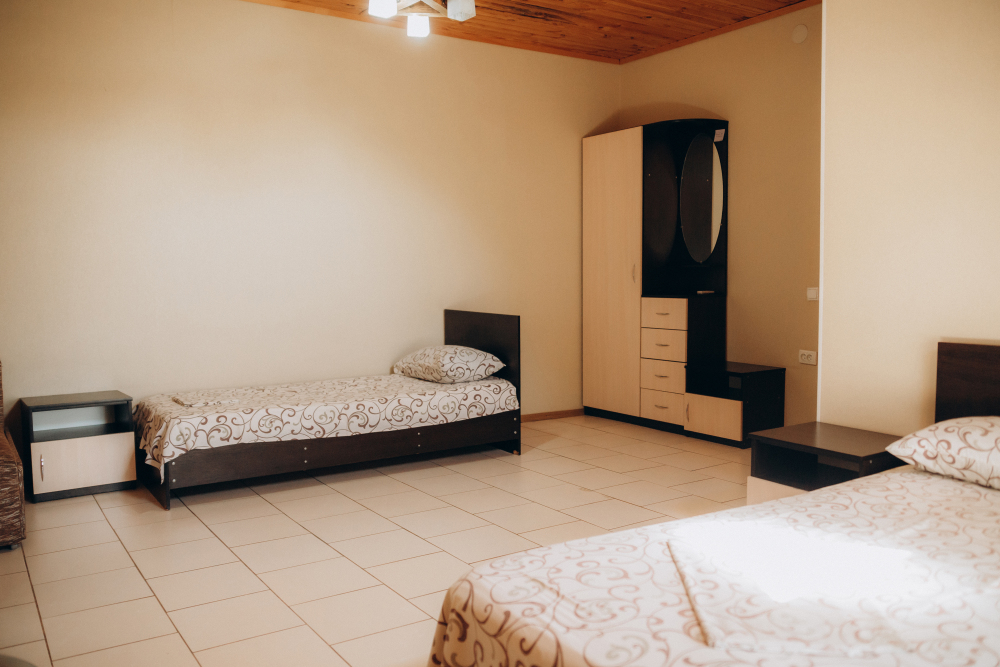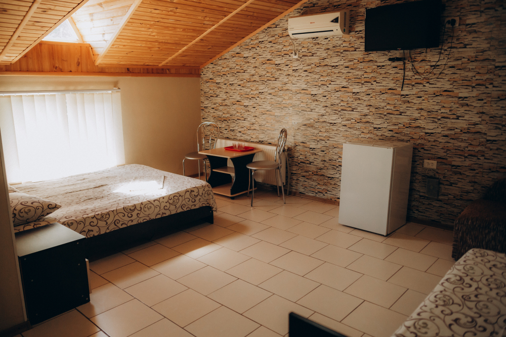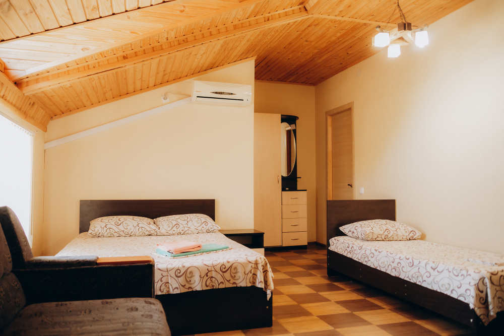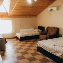 Номер представляет собой комфортное и просторное помещение, идеально подходящее для семейного отдыха или отдыха небольшой компанией. В номере предусмотрены двуспальная и односпальная кровати, а также удобный двуспальный диван, что позволяет разместить до 5 гостей.