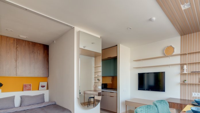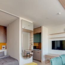 Яркая студия с дизайнерским ремонтом в апарт-отеле находиться рядом с «Садом Будущего» и в двух минутах от метро и МЦК (ст. Ботанический сад).