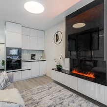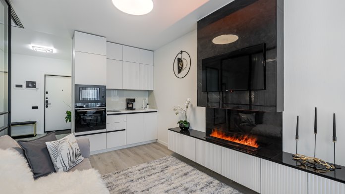 Просторная кухня-гостиная со всей посудой и техникой, мягким диваном, Smart TV и декоративным камином создадут волшебную атмосферу в любое время суток.