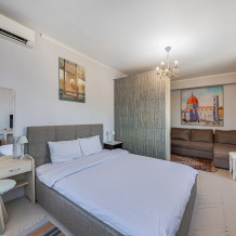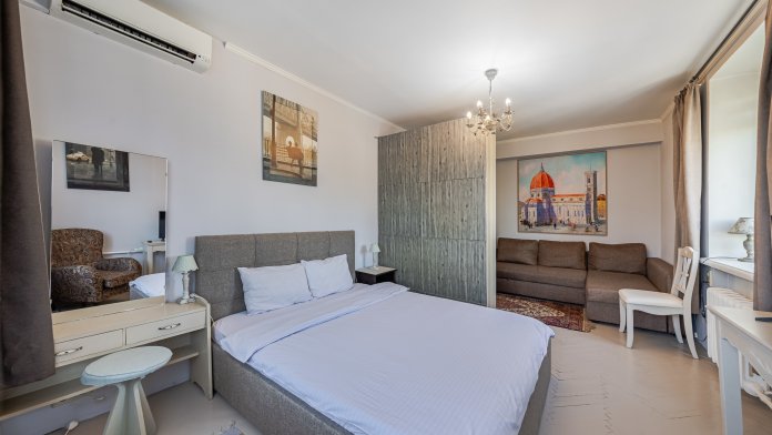 В квартире имеется просторная гостиная, уютная спальня, полностью оборудованная кухня с бытовой техникой (холодильник, плита, микроволновая печь, посудомоечная машина), а также столовая зона для приятных посиделок. Ванная комната оборудована стиральной машиной. Квартира также оснащена мебелью, включая удобную мягкую мебель в гостиной и спальне, обеденный стол с стульями, шкафы для хранения одежды и других вещей. Есть доступ к интернету и телевизору со Смарт ТВ для развлечения и работы.