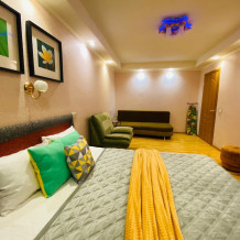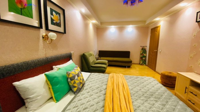 Хороший ремонт, стеклопакеты, ламинат. Есть вся необходимая мебель для комфортного проживания: двухспальная тахта, мягкая мебель, бытовая техника, санузел «под ключ». Стиральная машина, плазменный ТВ, посуда, всё необходимое для комфортного проживания. Безлимитный Wi-Fi Интернет.