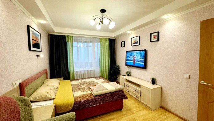 Хороший ремонт, стеклопакеты, ламинат. Есть вся необходимая мебель для комфортного проживания: двухспальная тахта, мягкая мебель, бытовая техника, санузел «под ключ». Стиральная машина, плазменный ТВ, посуда, всё необходимое для комфортного проживания. Безлимитный Wi-Fi Интернет.