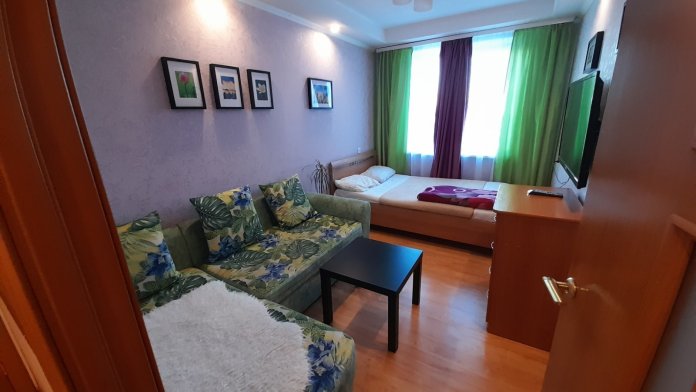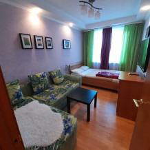Хороший ремонт, стеклопакеты, ламинат. Есть вся необходимая мебель для комфортного проживания: двухспальная тахта, мягкая мебель, бытовая техника, санузел «под ключ». Стиральная машина, плазменный ТВ, посуда, всё необходимое для комфортного проживания. Безлимитный Wi-Fi Интернет.