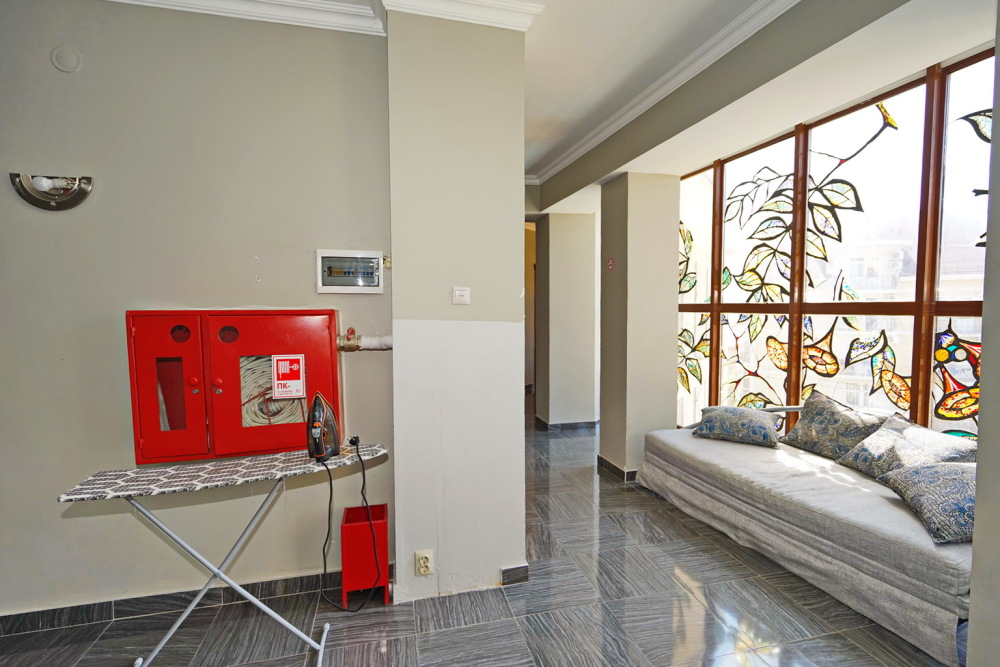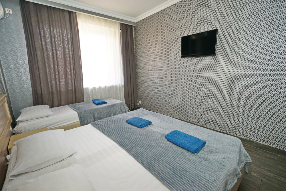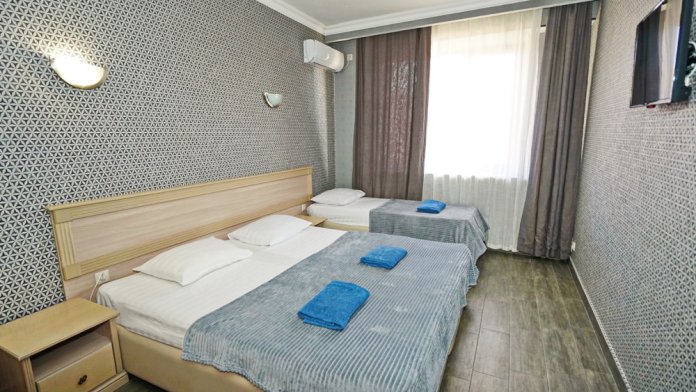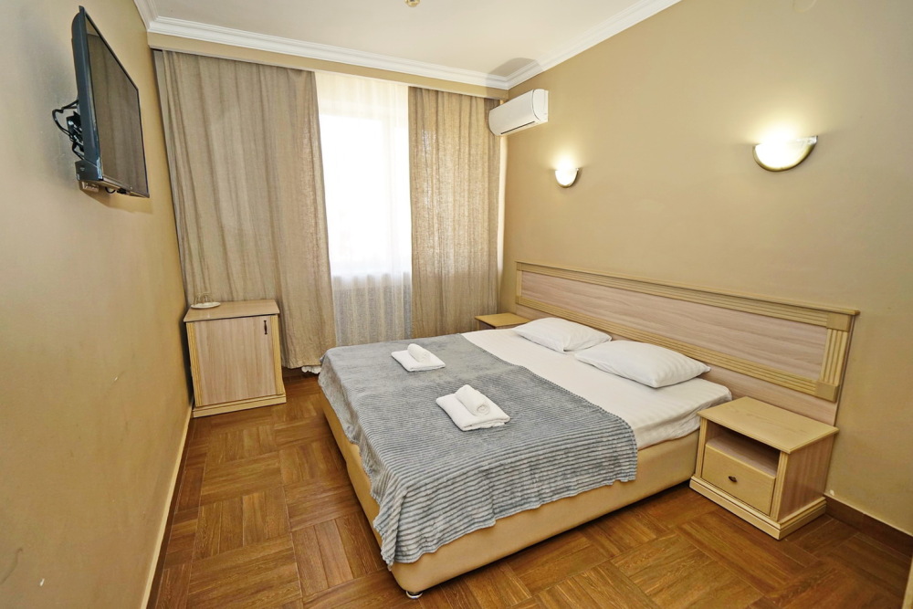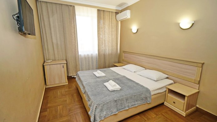 Комфортные номера со всей необходимой техникой. Кровати трансформеры (2 односпальные или 1 двуспальная кровать) и кресло-кровать, прикроватные тумбы, стол, стулья, шкаф, вешалки, зеркало, постельное белье, полотенца, фен, телевизор, чайник, интернет кабельное, кондиционер, холодильник, санузел совмещённый.