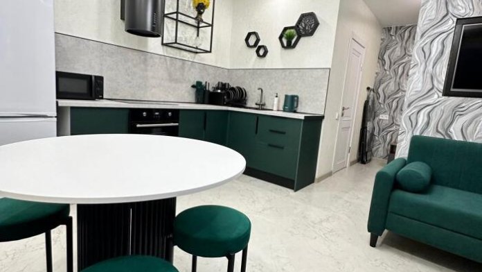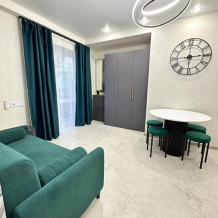 Люксовые апартаменты с дизайнерским ремонтом по типу полноценной квартиры, которая состоит из спальни и кухни-гостиной. Номер оснащён двуспальной кроватью, двуспальным диваном, прикроватными тумбами, комодом, шкафом для вещей, обеденной зонной и кухней с необходимой посудой. Так же в номере есть телевизор, холодильник, кондиционер, стиральная машина, фен, чайник, микроволновка ,плита, духовой шкаф, утюг с гладильной доской, сейф, интернет, кабельное, сушилка для одежды, гигиенические принадлежности в ванной, постельное белье, наборы полотенец.