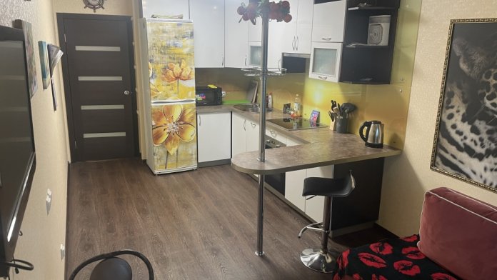 В квартире: телевизор, диван, который преобразуется в полноценное спальное место для 2-х гостей на кухне-гостиной.