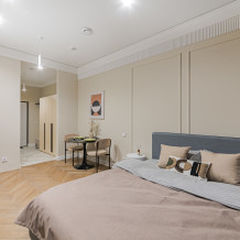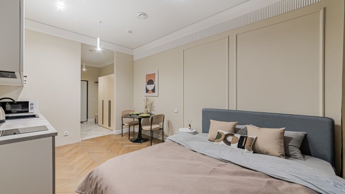 В апартаментах имеется все необходимое для комфортного пребывания на один или несколько дней! Просторная двуспальная кровать позволит вам хорошо выспаться и насладиться отдыхом в полной мере. На полностью укомплектованной кухне с холодильником, плитой, СВЧ, чайником и набором посуды вы всегда сможете приготовить свои любимые блюда. В стильной и светлой ванной комнате вы сможете принять горячий душ, а также освежить свои вещи в стиральной машине. Планируете задержаться в столице подольше? Не переживайте, в квартире достаточно места, чтобы разместить все личные вещи!