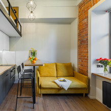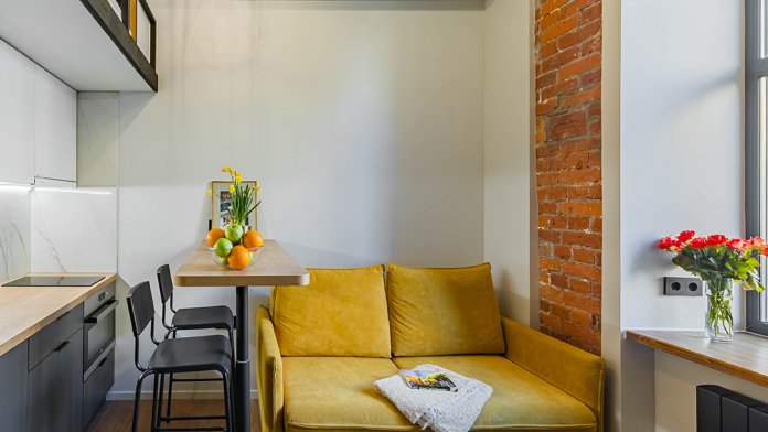 В совмещенной кухне-гостиной мягкий диван, который служит дополнительным спальным местом. На кухне есть вся необходимая посуда и техника для приготовления любимых блюд: плита, духовка и холодильник.