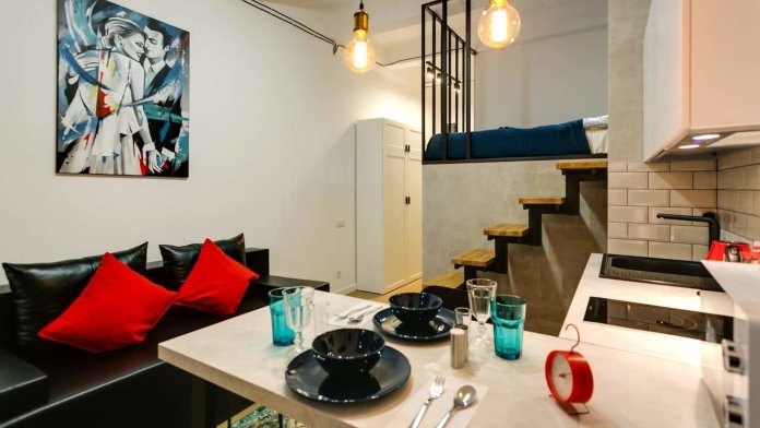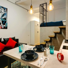 Современные апартаменты с высококлассным дизайнерским ремонтом и разнообразными элементами декора, которые делают лофт уникальным и очень универсальным. Гостей ждут экипированная кухня с СВЧ, плитой, холодильником и электрическим чайником. Новейший ремонт, стильный интерьер, все необходимое для короткого пребывания. Современная небольшая ванная комната со стиральной машиной. Для придания большего уюта и уникальности спальня вынесена на второй уровень, а мягкий диван размещен на кухне.