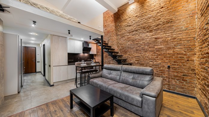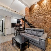 В апартаментах выполнен высококлассный дизайнерский ремонт. Гостей ждет полностью экипированная кухня с плитой, холодильником и электрическим чайником, посудомоечной машиной. Современная ванная комната, где есть все мыльные принадлежности и полотенца, имеется удобная стиральная машина. В гостиной расположен двухместный диван для комфортных и уютных встреч с друзьями. ТВ и стильное освещение. На втором этаже расположено основное спальное место и просторная гардеробная, что удобно для короткого и более длительного пребывания в апартаментах.