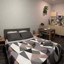 Кухонная зона оборудована всей необходимой техникой и посудой. В спальной зоне находится двуспальная кровать и шкаф. В ванной комнате установлена ванна, стиральная машинка.