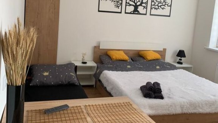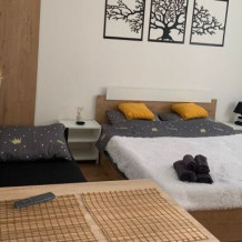 В квартире кухонная зона оборудована всей нeoбходимoй тeхникой и поcудoй. В спальной зоне находится двуспальная кровать и шкаф. В ванной комнате установлена душевая кабинка.