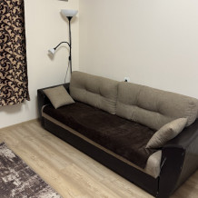 Кухонная зона оборудована всей необходимой техникой и посудой. В спальной зоне находится двуспальный раскладной диван и шкаф. В ванной комнате установлена душевая кабинка.