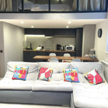 Мы оснастили апартамент тремя раздельными комнатами с двухспальными кроватями с ортопедическими матрасами разной степени жёсткости на втором уровне и диваном в гостиной, который раскладывается в ровное спальное место (апартамент вмещает до 10 гостей). Два полноценных санузла с душем, на первом и втором уровне. С легкостью можно приготовить завтрак, обед или романтический ужин, для этого есть необходимая посуда и приборы, плита, микроволновка, холодильник. Второй этаж полноценный, высотой 2м.