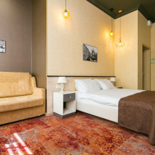 Однокомнатный номер предназначенный для проживания одного или двух человек с двумя раздельными кроватями или с одной большой кроватью. Номер оборудован раскладным диваном, который может использоваться как дополнительное место.