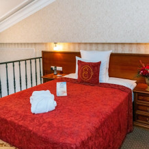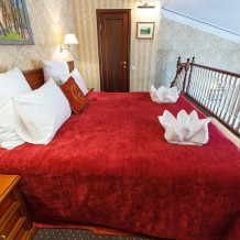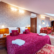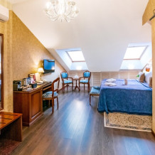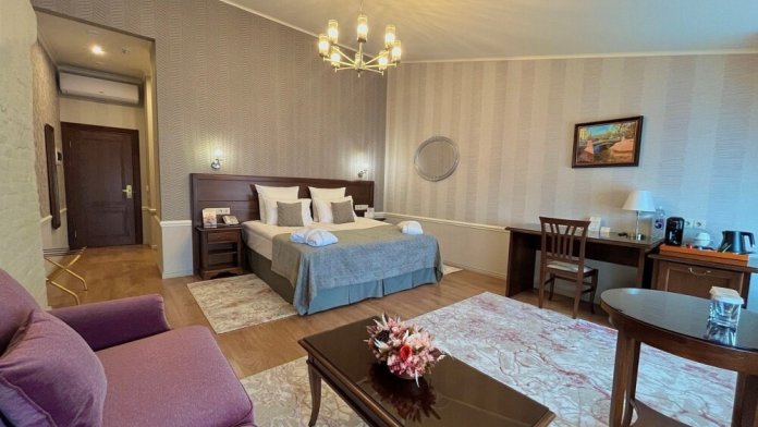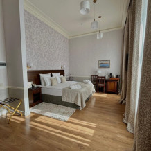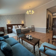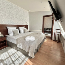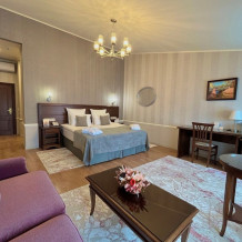 В каждом из номеров данной категории есть возможность сделать как одну большую двуспальную кровать King Size (180*200), так и две раздельные (90*200). В номере есть рабочая зона с удобным письменным столом и небольшой гостиный уголок со стульями и чайным столиком.
