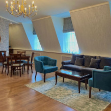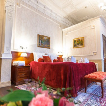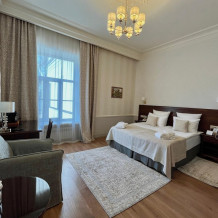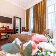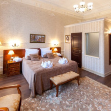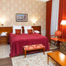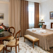 Роскошный номер люкс с видом на Миллионную улицу. Украшенный лепниной потолок, изысканный интерьер воссоздает атмосферу аристократических салонов старого Петербурга. Зонирование люкса обеспечивает максимальный комфорт и удобство для отдыха и досуга. Гостиная с мягким диваном, креслами и журнальным столиком, спальня с кроватью размера King Size (280х225), прихожая и просторная ванная комната.