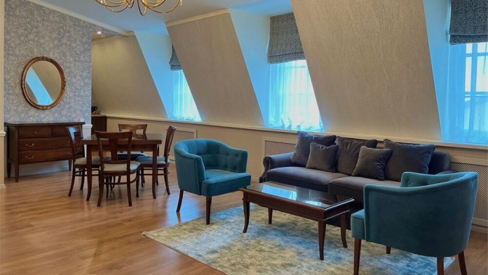 Двухуровневая планировка люкса разделена на две функциональные зоны: гостевую и спальную. Гостевая зона представляет пространство площадью 37 кв. м. и включает в себя гостиную с диваном, креслами и журнальным столиком, рабочую зону со столом и письменными принадлежностями.
