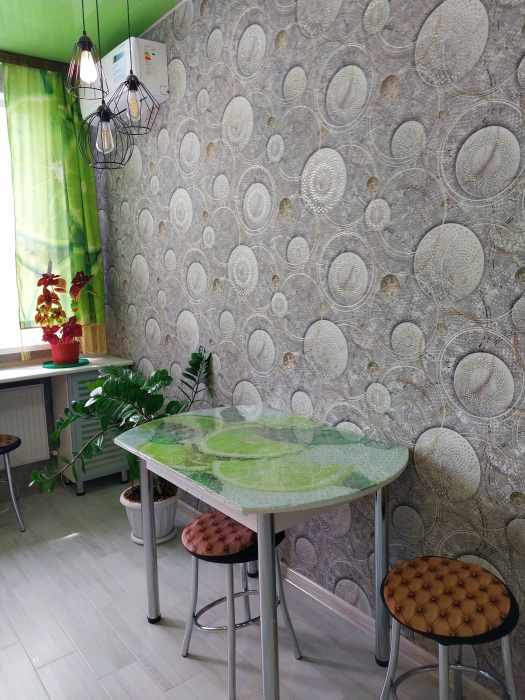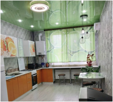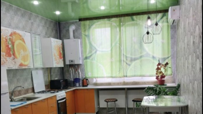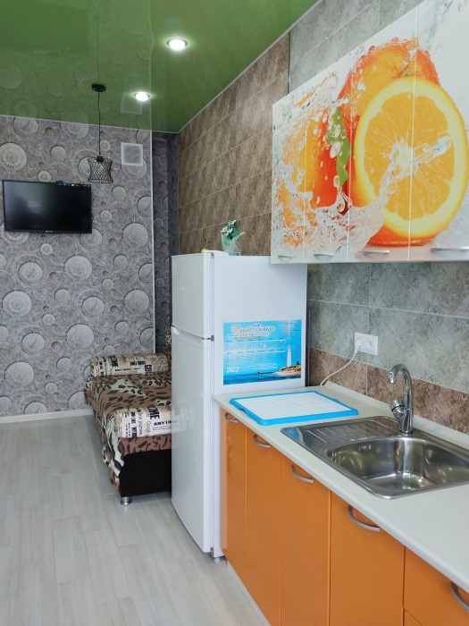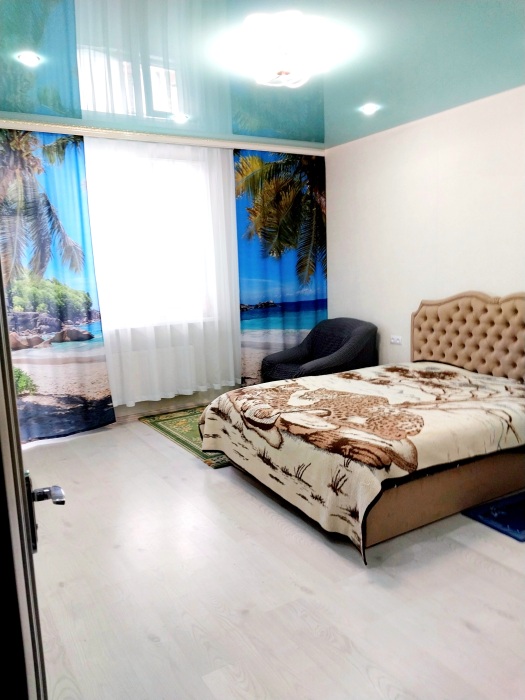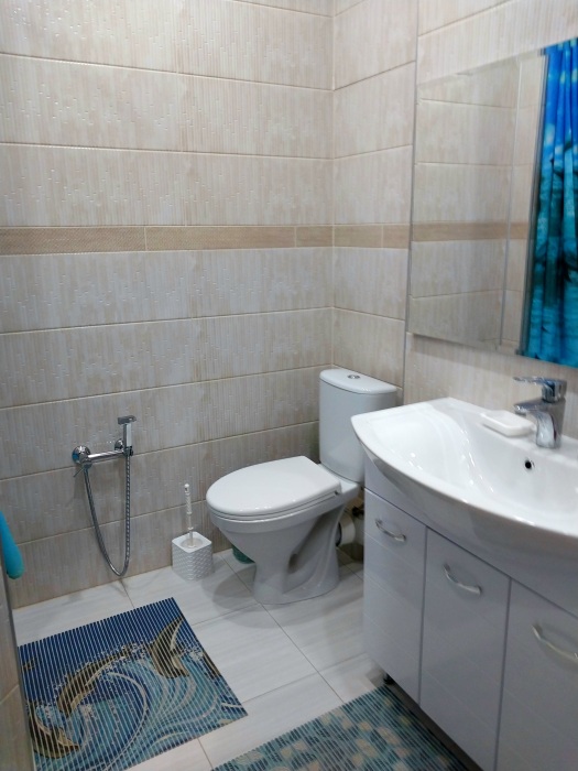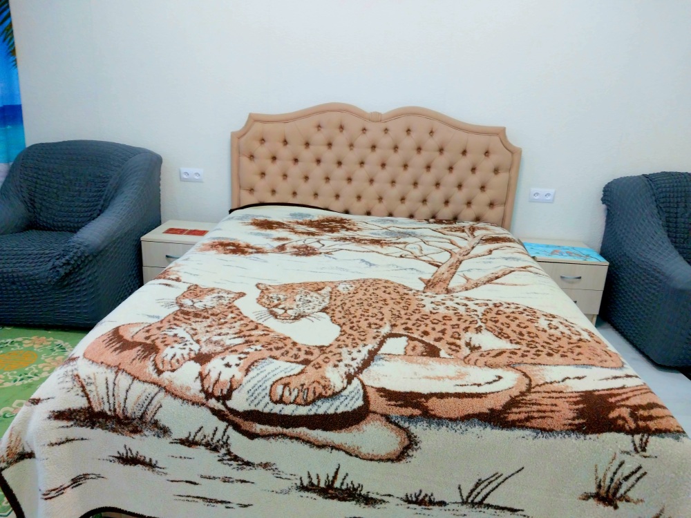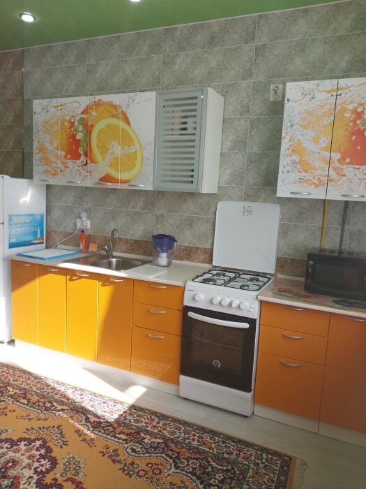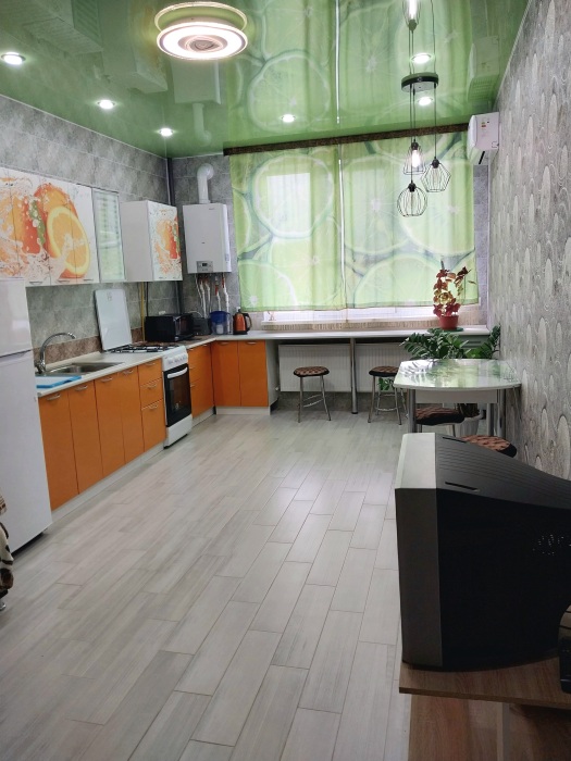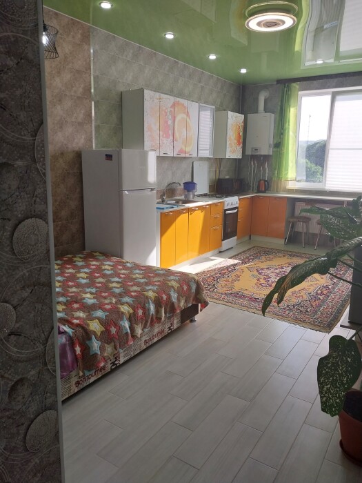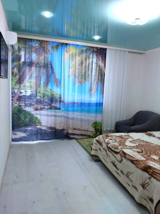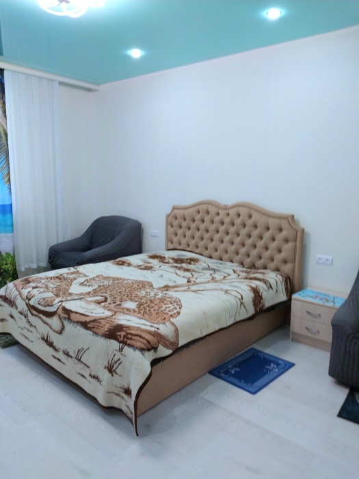 Оборудована всем необходимым для комфортного проживания. Для гостей бесплатный интернет. В комнате стоит удобная 2-спальная кровать, два мягких кресла, смарт телевизор, кондиционер. На кухне-гостиной стоит 2-спальный диван, телевизор, кондиционер, микроволновка, чайник, газовая плита с духовкой, мебель, вся необходимая посуда. В ванной комнате стоит стиральная машина, есть гигиенический душ, фен, большая кабинка с душем, вода горячая круглые сутки. Для всех гостей белье и полотенца для лица. На большой лоджии стоит односпальная кровать, сушилка, гладильная доска с утюгом.