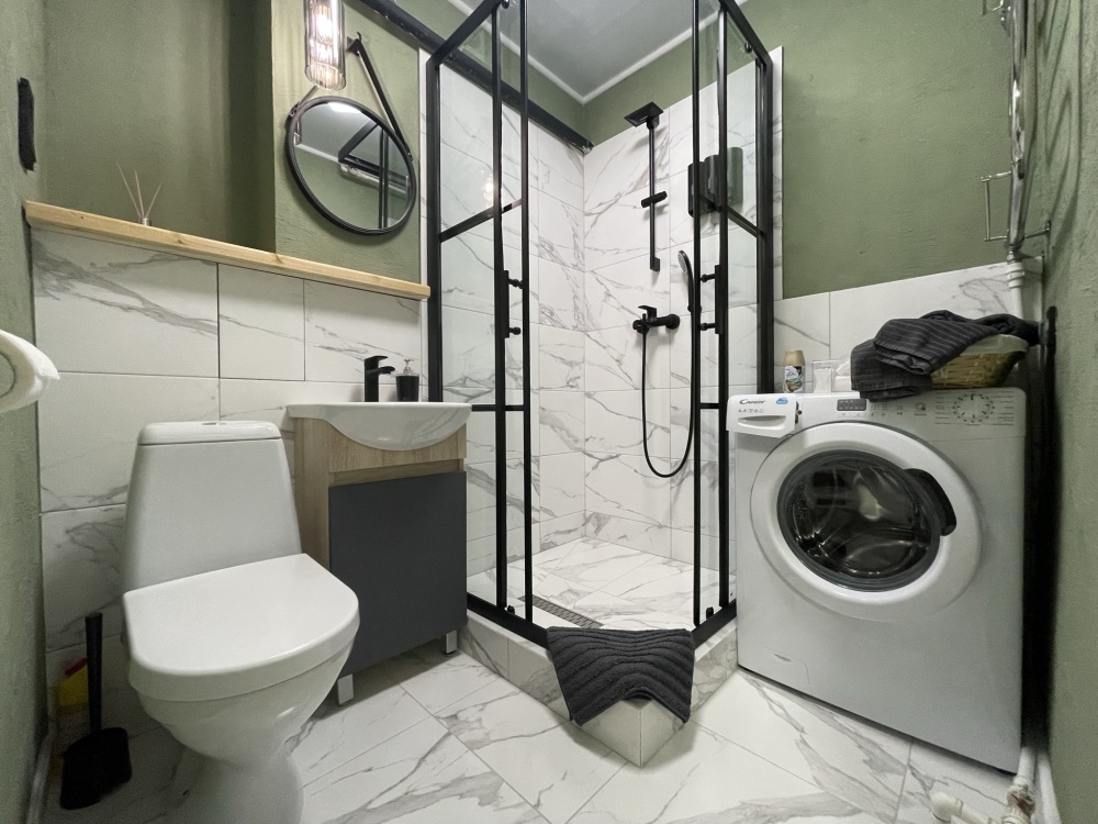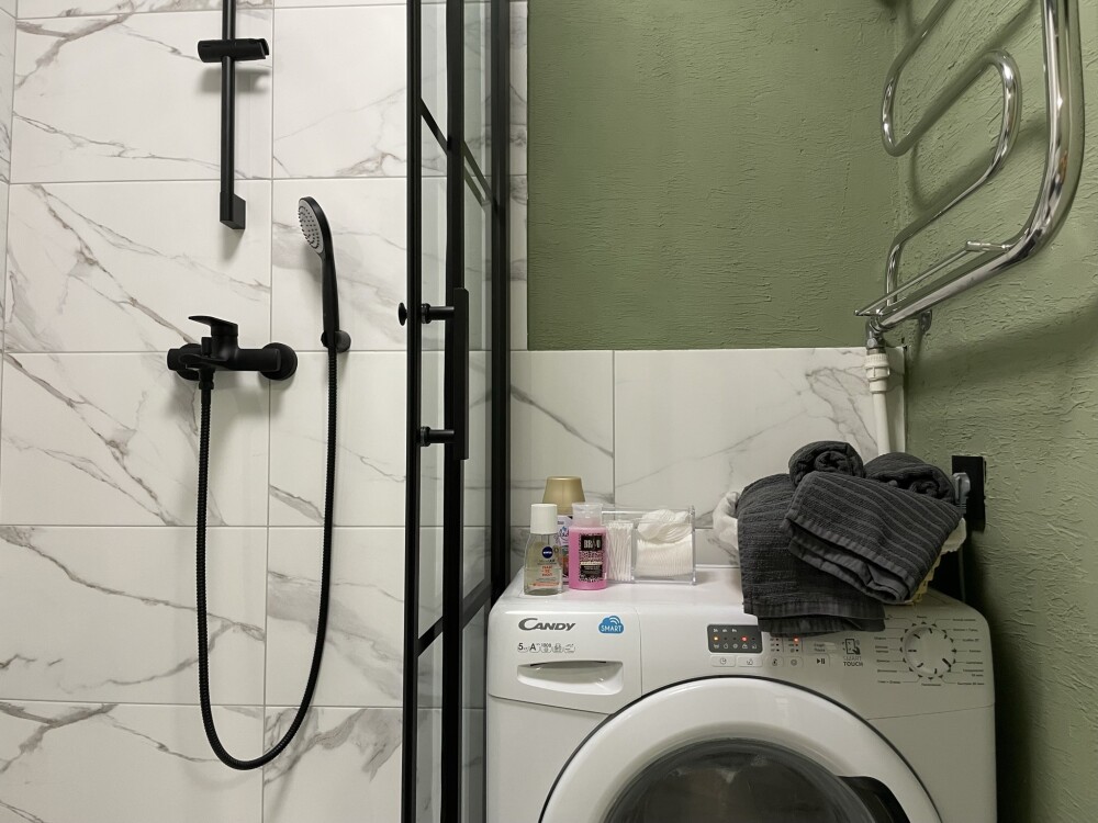 В ванной комнате установлена душевая, стиральная машинка. Предлагаем полный набор гигиенических принадлежностей.