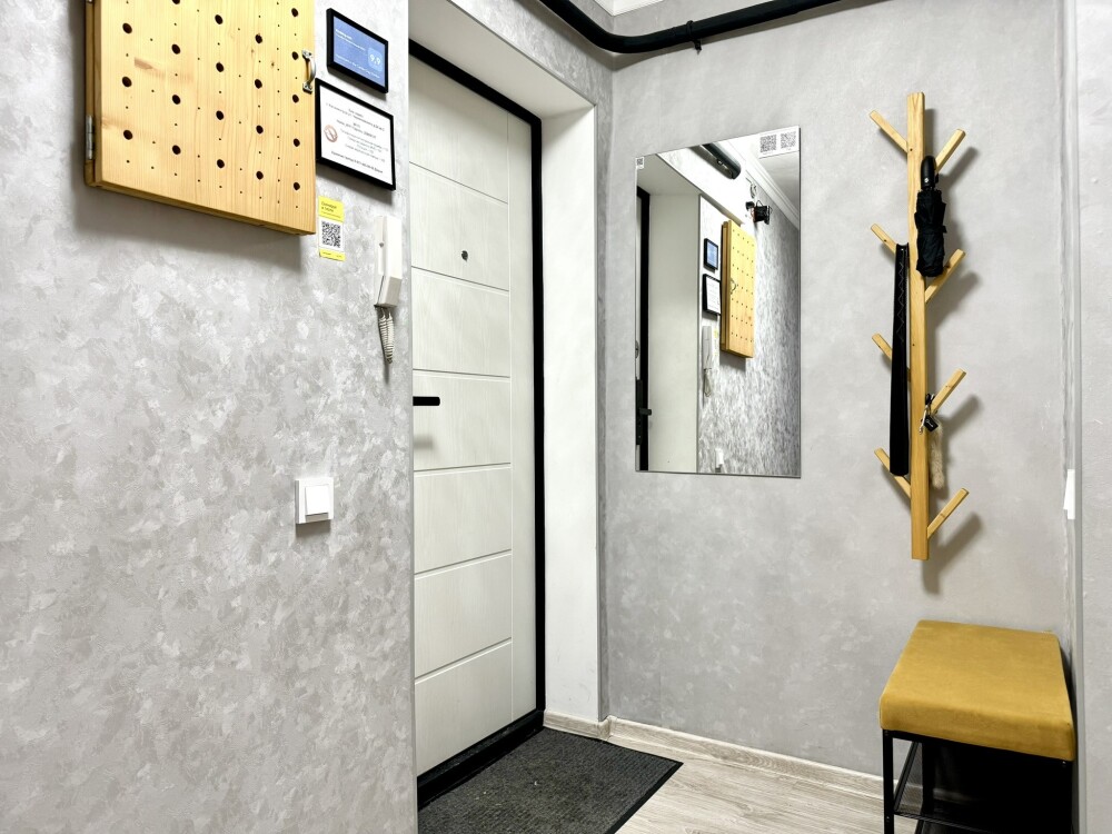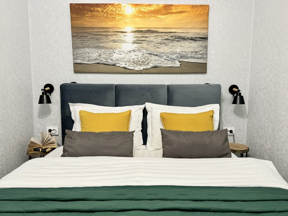 Спальня: оснащена двуспальной кроватью 160*200, прикроватные тумбы и светильники, шторы блек-аут. Окна выходят в тихий двор.
