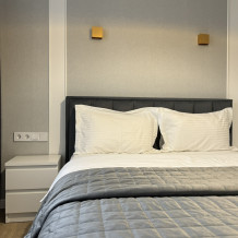 Спальня: двуспальная кровать 160х200, прикроватные столики, прикроватные светильники, выход на лоджию, окна лоджии выходят во двор.