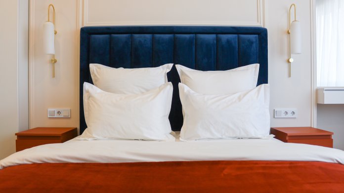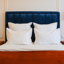 Спальня оснащена двуспальной кроватью (160х200) с ортопедическим матрацем, прикроватные столики и светильники, журнальный столик, рабочий стол, ТВ с кабельными каналами, функцией Smart TV, Wi-fi на всей территории.