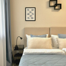 В спальне для комфортного отдыха 1 двуспальная или 2 односпальных кровати и раскладывающееся кресло кровать. Прикроватные светильники, шторы блек аут, smart ТВ.