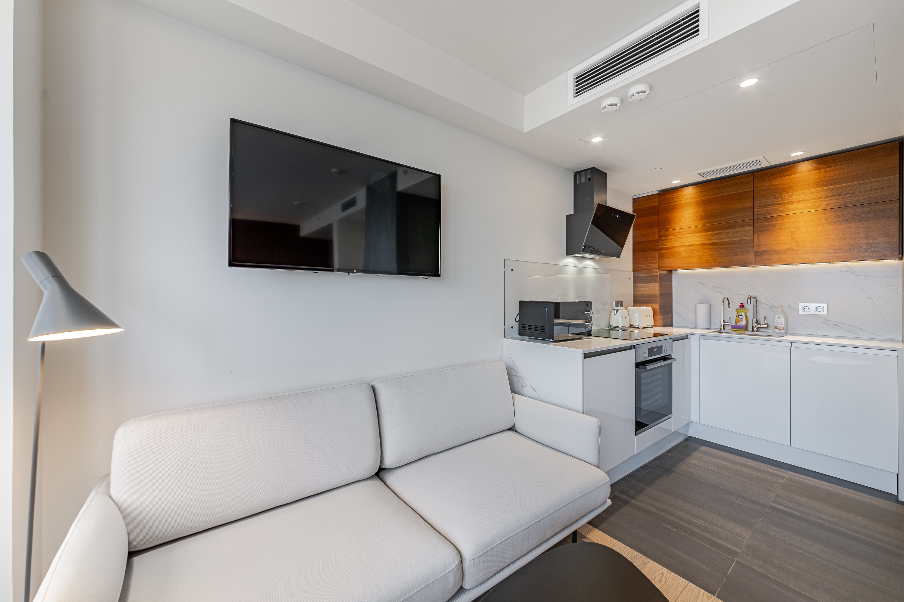 Апартаменты имеют полноценную удобную кухню, где Вы сможете приготовить свои любимые блюда. Кухня оборудована всей необходимой техникой: электрическим чайником, микроволновой печью, духовым шкафом, вытяжкой, холодильником, кофемашиной и даже тостером.