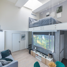 - на 2-ом уровне расположена зона спальни с двухспальной кроватью и книжный стеллаж.