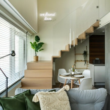 В апартаментах 2 уровня: на 1-ом расположена кухня и зона гостиной с диван и большим проектором с функцией SMART TV. Идеальный вечер под любимые фильмы и сериалы обеспечен! На 2-ом уровне расположена небольшая, но очень уютная спальня с двухспальной кроватью, телевизором и настольными играми. Вам точно не придется скучать! Определенно главным преимуществом являются вид из окна на исторический центр Москвы.