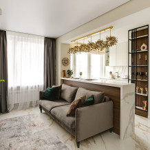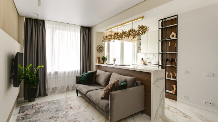 В апартаментах вас ждет множество интересных дизайнерских решений! Кухня отделена от гостиной большой и удобной барной стойкой на 4-х человек.