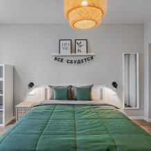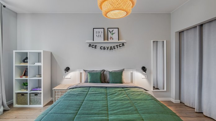 В квартире большие панорамные окна, а это значит, что у вас всегда будет светло. В комнате просторная двуспальная кровать, кондиционер и гардеробная. Это идеальны вариант не только для тех, кто планирует поездку в столицу на пару дней, но и тех, кто решит остаться на длительное время.