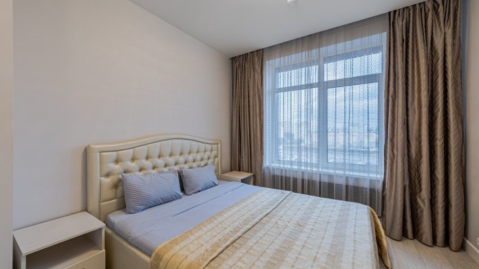 Квартира оформлена в современном стиле, в светлых бежевых оттенках. Она полностью укомплектована мебелью и бытовой техникой, в ней с комфортом могут разместиться 4 гостя.