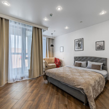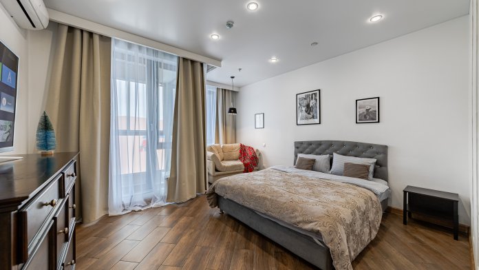 В квартире много света за счет больших окон во всю стену. Двуспальная кровать с хорошим матрасом служит полноценным спальным местом. Раскладной диван служит полноценным спальным местом для взрослого или ребенка. Вы почувствуете комфорт и домашний уют.