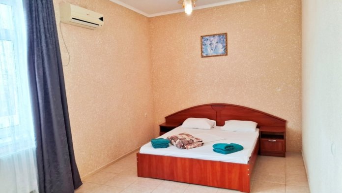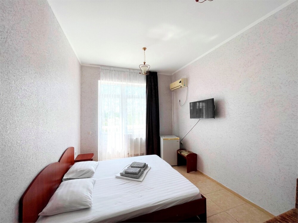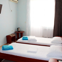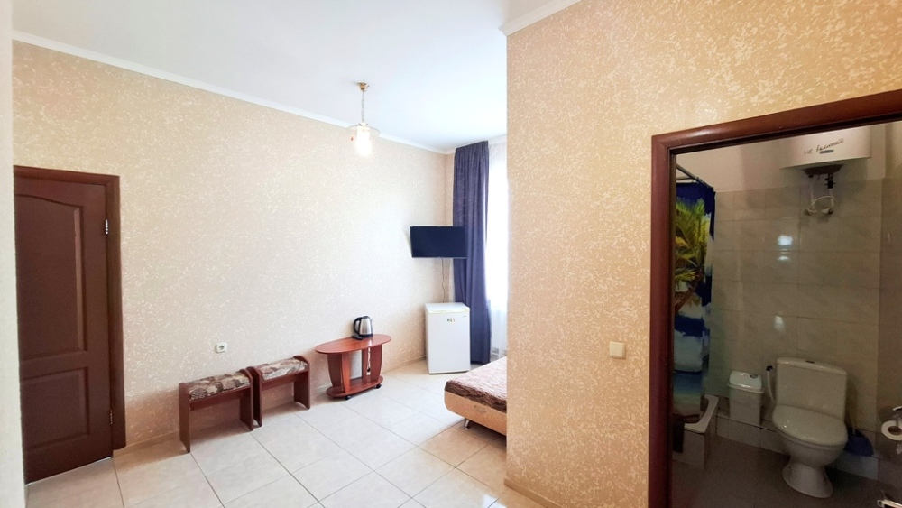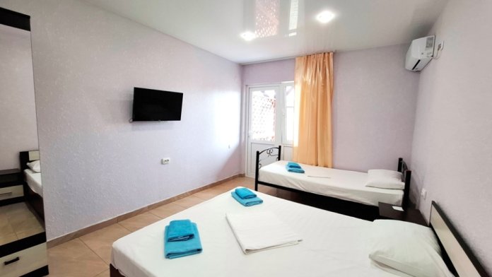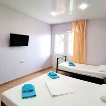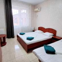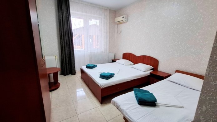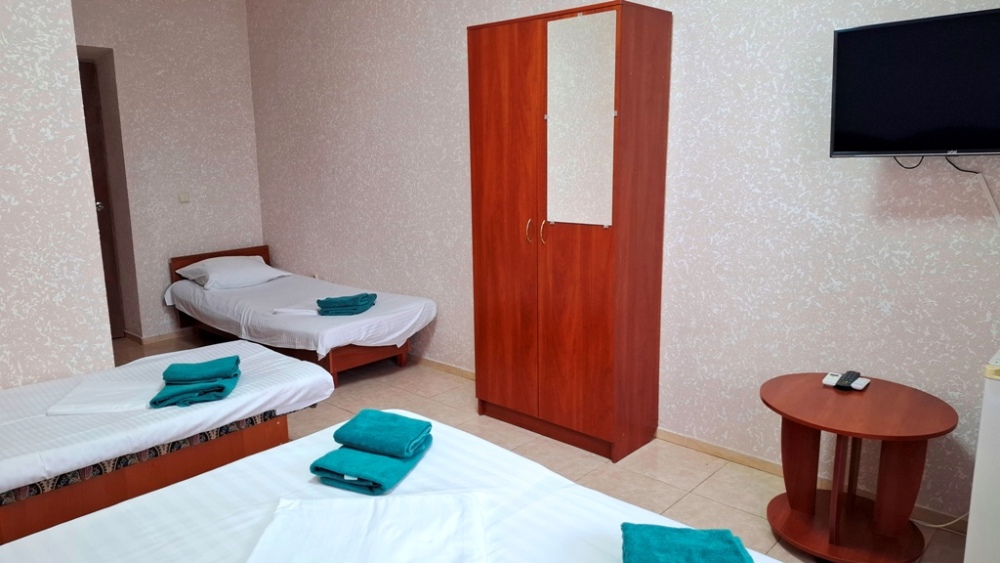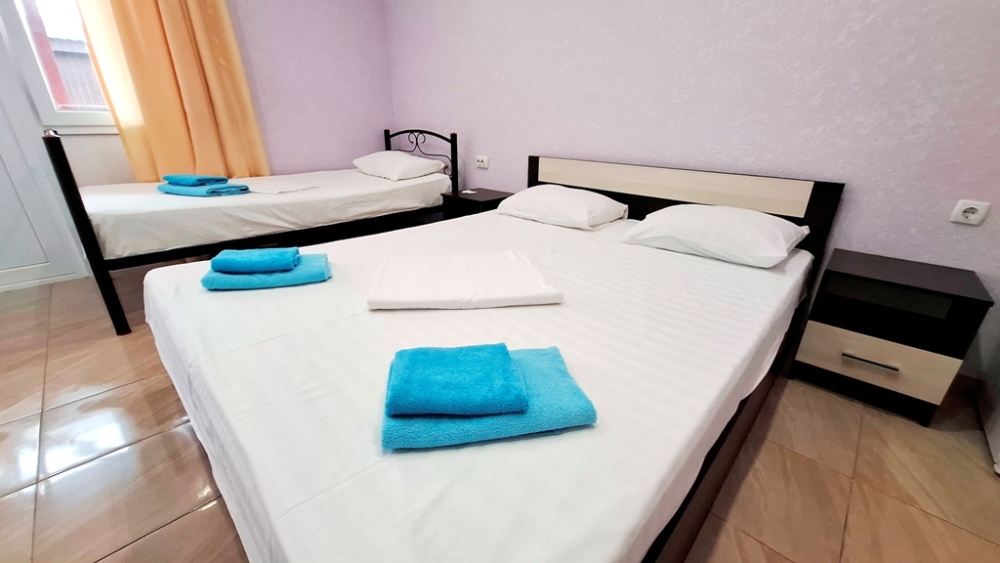 Уютный 3-местный номер с отдельным входом и небольшой террасой с столиком и стульями - это прекрасное место для отдыха, где гости могут наслаждаться комфортом и удобствами, которые обеспечивают приятные впечатления и хороший отдых. В номере 1 двуспальная кровать и одна полноценная односпальная кровать, кондиционер, санузел, телевизор, холодильник, фен, электрочайник.