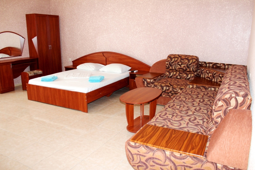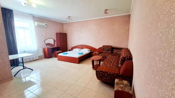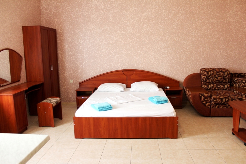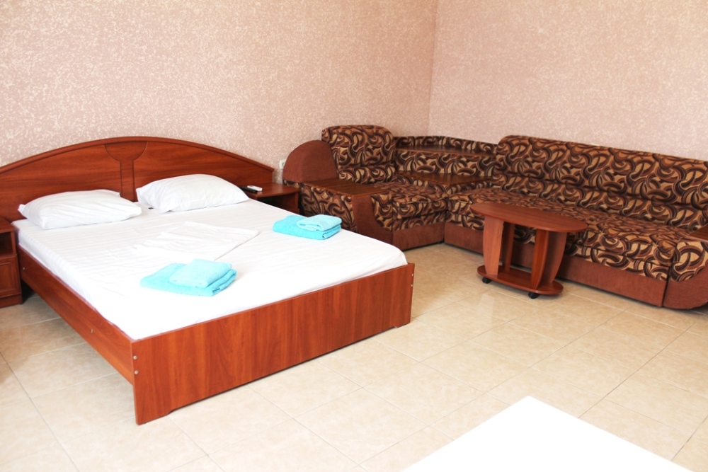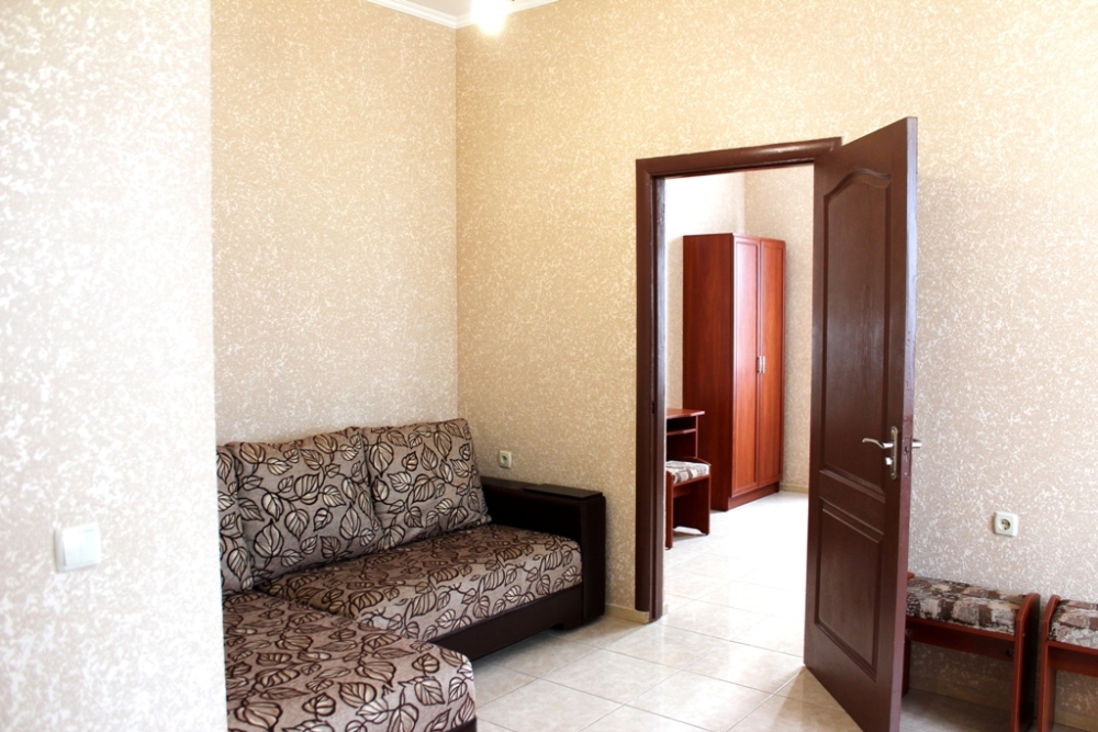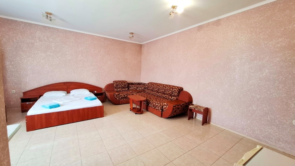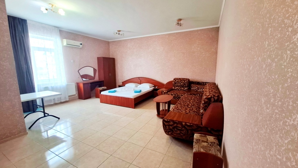 Просторный и светлый двухкомнатный номер с балконом, который может вместить до 5 человек. В номере расположена большая двуспальная кровать, раскладной двуспальный диван и односпальный диванчик, что делает его идеальным для семейного отдыха или групповой поездки. Номер оборудован кондиционером, санузлом с душевой кабиной, телевизором, холодильником, феном, электрочайником.