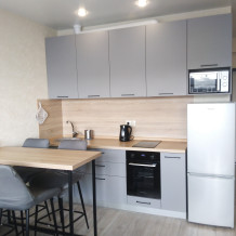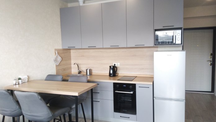 Кухонная зона: электрическая плита, вытяжка, духовой шкаф, холодильник, микроволновая печь, электрический чайник, кухонный стол, стулья, столовые приборы и посуда.