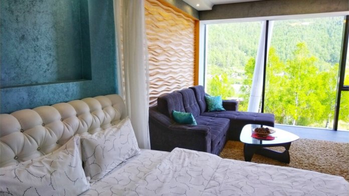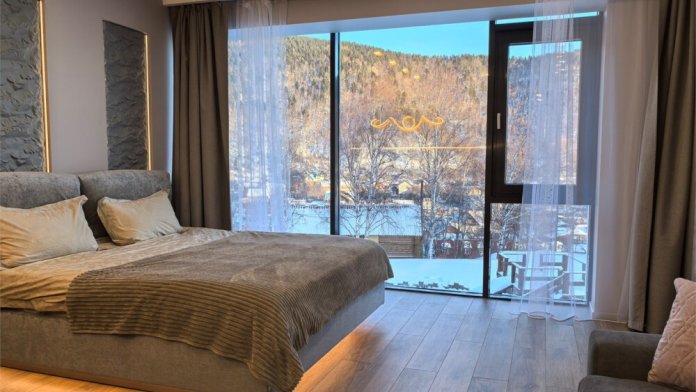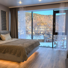 Номер на верхнем этаже с отличными видами на Листвянку и Байкал, с дизайнерским ремонтом, с огромным окном, теплыми полами, собственной кухней.