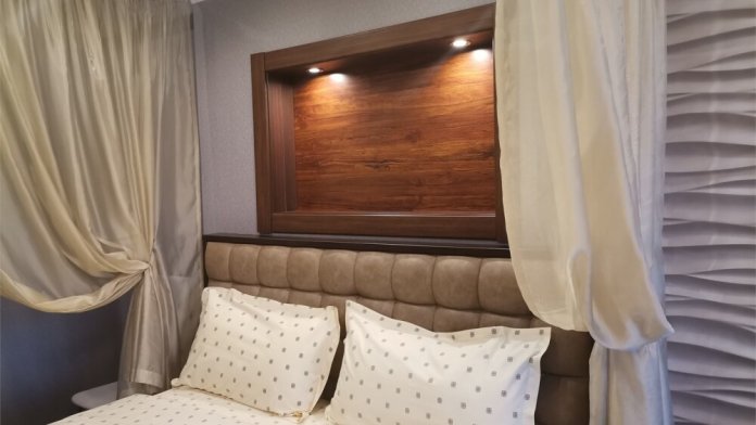 Дизайнерский интерьер, современные отделочные материалы. С панорамным окном и роскошным электрокамином, кондиционером, собственными контурами теплых полов. С интересной подсветкой по зонам. Огромная удобная двуспальная кровать с «парящим эффектом». Шторы открываются пультом от электрокарниза, можно любоваться пейзажем за окном, не вставая с кровати. Красивая и функциональная кухня. Стол и барная стойка для приятного общения. Большой холодильник, духовой шкаф, плита, микроволновка, кофеварка, стиральная машинка. Красивая ванная комната с интересной подсветкой. Номер расположен на втором этаже.