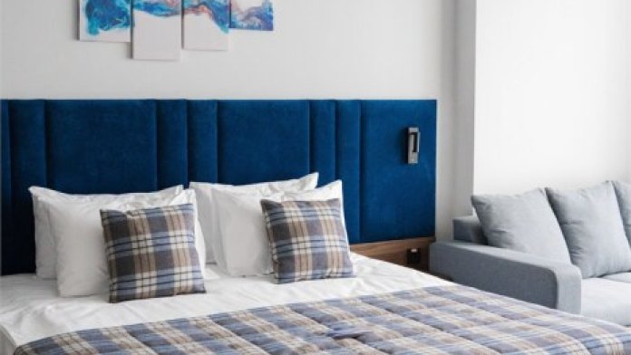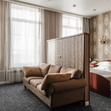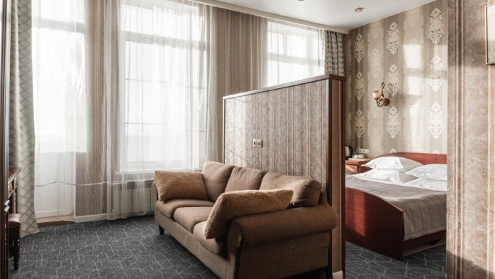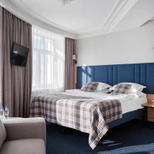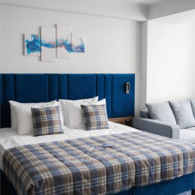 В номере: две односпальные или большая двуспальная кровать, шкаф для одежды, раскладной диван, плательный шкаф, телевизор со Смарт ТВ, гладильный центр, телефон, сейф.