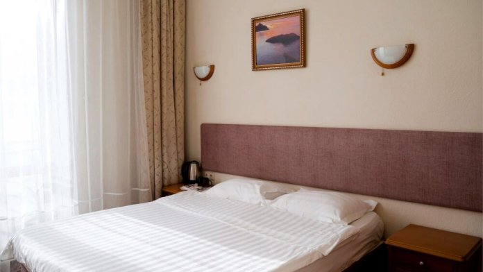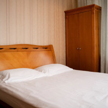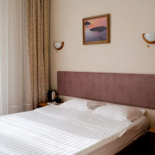 Номер находится в дополнительном корпусе «Маячок». В номере: одна двуспальная кровать, прикроватные тумбочки, светильники, трюмо, комод с зеркалом, плательный шкаф, телевизор, телефон, уютная ванная комната.