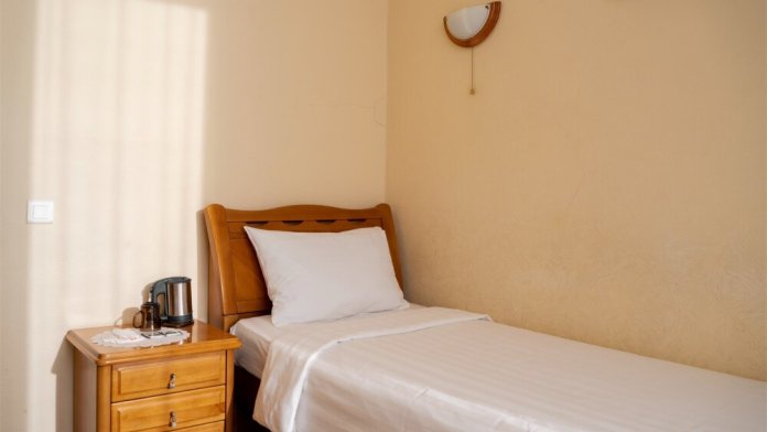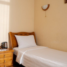 В номере: одна кровать, прикроватные тумбочки, трюмо с зеркалом, плательный шкаф, телевизор, телефон, уютная ванная комната.